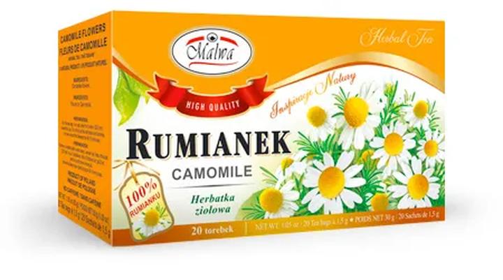• Rumianek – działa przeciwbólowo i przeciwzapalnie, łagodzi dolegliwości żołądkowe.
