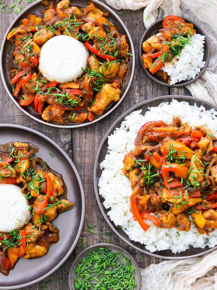 Kurczak po chińsku Szybkie danie z aromatycznymi przyprawami, świeżymi warzywami i ryżem jaśminowym.